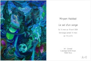 المعرض يحمل عنوان «Le sel d’un songe» (ملحُ حلم)، ويُفتتح في 14 آذار/مارس 2026 ويستمر حتى 18 نيسان/أبريل 2026، وذلك في صالة Art : Concept الكائنة في 4 Passage Sainte-Avoye – 75003 Paris. ويُقام حفل الافتتاح (Vernissage) يوم السبت 14 آذار من الساعة الحادية عشرة صباحاً حتى التاسعة مساءً.