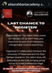 أكاديمية الياس الرحباني وجامعة البلمند عن اقتراب موعد إقفال باب التسجيل في مسابقة Talent SHOW